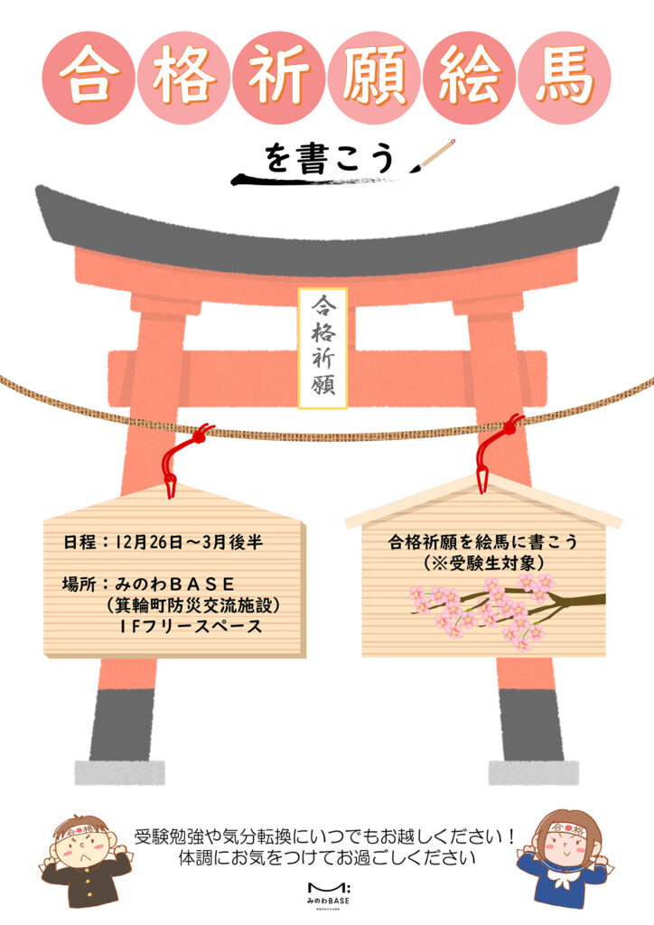 合格祈願絵馬を書こう!2025年12月26日(金)~ 新着情報 2025年12月26日(金)より、みのわBSE 1F フリースペースにて「合格祈願絵馬を書こう!」を開催いたします。受験生の皆さん、願いを書いて志望校合格を勝ち取ろう! SNSに送れば更に合格率がアップすることまちがいなし。 Share: Older Post むかしのあそび体験会 2026年2月7日(土)開催 Newer Post Photo X’mas(フォトクリスマス)に行こう!